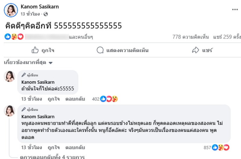 นอกจากการไลฟ์สด ขนมยังได้โพสต์ข้อความผ่านเฟซบุ๊คส่วนตัว Kanom Sasikarn ระบุว่า "คิดดีๆคิดอีกที" พร้อมคอมเมนต์เพิ่มเติมว่า "ถ้ามั่นใจก็ไปต่อค่ะ" สะท้อนให้เห็นถึงความพยายามในการจัดการกับสถานการณ์ที่เกิดขึ้นอย่างรอบคอบ