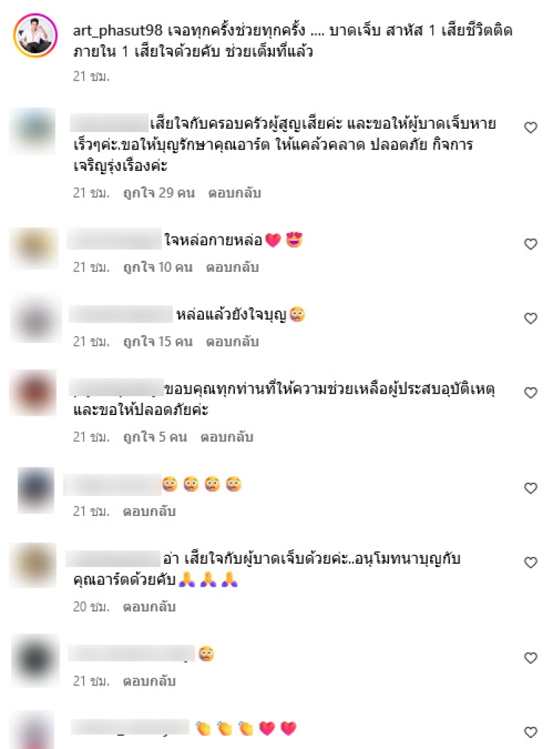 เหตุการณ์ครั้งนี้มีผู้บาดเจ็บสาหัส 1 ราย และเสียชีวิต 1 ราย อาร์ตได้เล่าเหตุการณ์ผ่านอินสตาแกรมส่วนตัว @art_phasut98 พร้อมระบุว่า "เจอทุกครั้งช่วยทุกครั้ง บาดเจ็บสาหัส 1 เสียชีวิตติดภายใน 1 เสียใจด้วยครับ ช่วยเต็มที่แล้ว"