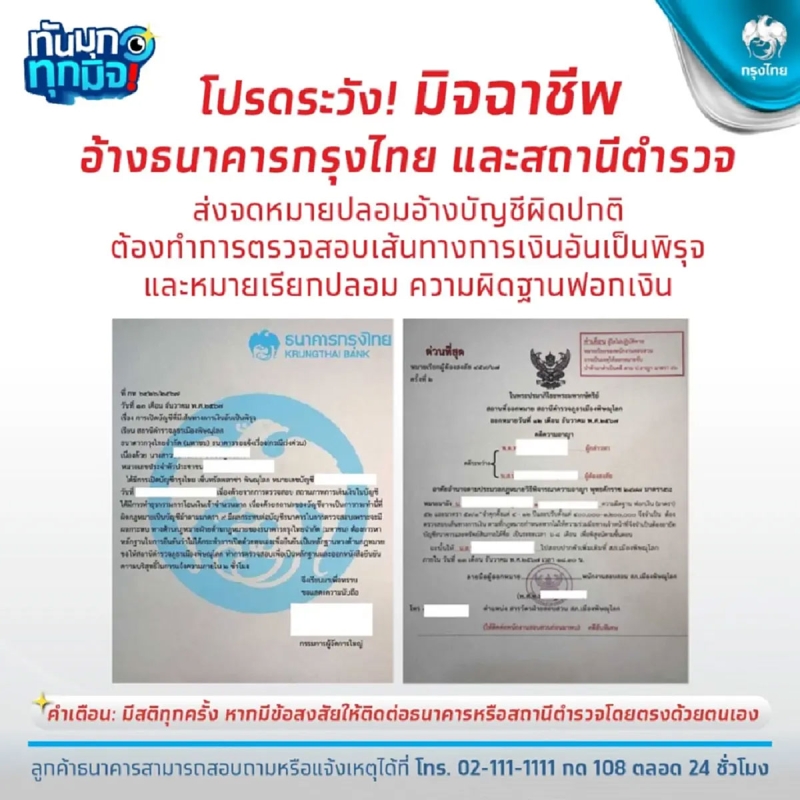 ธนาคารกรุงไทยได้ออกประกาศเตือนภัยฉบับล่าสุดผ่านเพจเฟซบุ๊ก Krungthai Care เพื่อแจ้งเตือนลูกค้าทุกท่านให้ระมัดระวังภัยจากมิจฉาชีพที่กำลังใช้วิธีการแอบอ้างเป็นทั้งเจ้าหน้าที่ธนาคารและเจ้าหน้าที่ตำรวจ