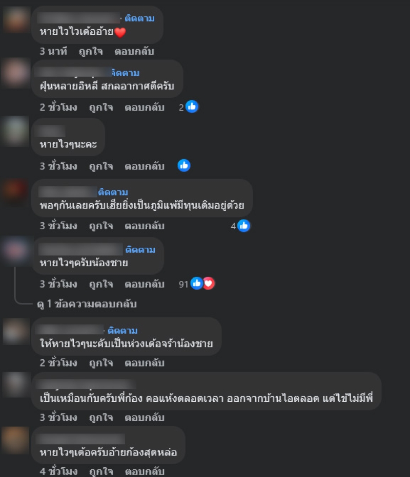 หลังโพสต์เล่าอาการ แฟนๆ แห่เข้ามาให้กำลังใจกันเพียบ พร้อมแชร์ประสบการณ์คล้ายๆ กัน โดยเฉพาะคนที่มีโรคภูมิแพ้เป็นทุนเดิม บอกว่าเจอหนักพอกัน
