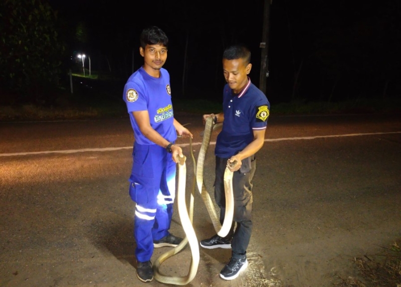 หลังรับแจ้งเหตุ เจ้าหน้าที่ได้ประสานงานกับทีมกู้ชีพจากองค์การบริหารส่วนตำบลสะท้อนและองค์การบริหารส่วนตำบลท่าประดู่ นำโดยนายอภิชาติ พรหมสงค์ และนายณรงค์ฤทธิ์ ยอดจันทร์ เร่งเข้าพื้นที่เพื่อจับงูจงอางทั้งสองตัว