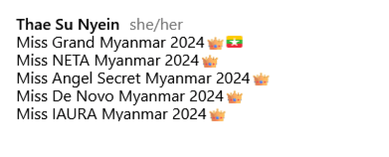 ล่าสุดมีการตรวจสอบพบว่า แตแต ได้อัปเดตโปรไฟล์อินสตาแกรมส่วนตัว โดยระบุชื่อเวทีประกวดที่เธออ้างว่าเคยได้มงกุฎมาแล้วทั้งหมด 5 เวที ได้แก่ Miss Grand Myanmar 2024, Miss NETA Myanmar 2024, Miss Angel Secret Myanmar 2024, Miss De Novo Myanmar 2024 และ Miss IAURA Myanmar 2024
