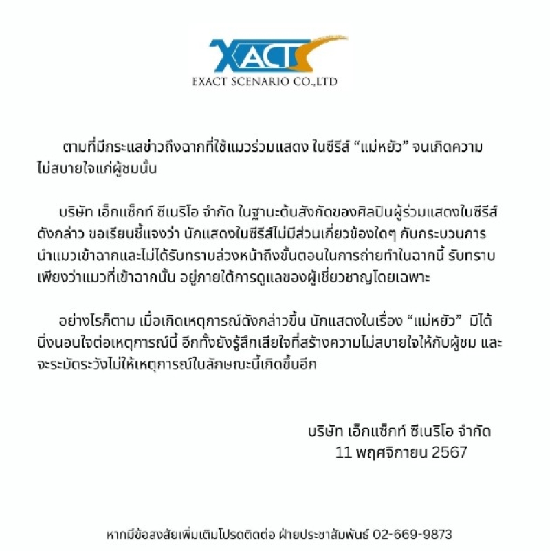 บริษัท เอ็กแซ็กท์ ซีเนริโอ เปิดแถลงการณ์ชี้แจงกรณีแมวถูกวางยาสลบในละครแม่หยัว ยืนยันนักแสดงไม่ทราบรายละเอียดการถ่ายทำ พร้อมแสดงความเสียใจต่อเหตุการณ์ที่เกิดขึ้น