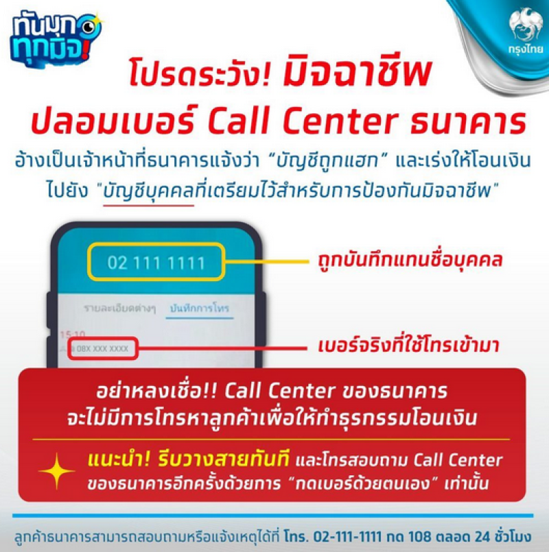ธนาคารกรุงไทยย้ำชัดว่า Call Center ของธนาคารจะไม่มีการโทรติดต่อลูกค้าเพื่อขอให้ทำธุรกรรมโอนเงินโดยเด็ดขาด หากได้รับโทรศัพท์ในลักษณะดังกล่าว ขอให้วางสายทันที และหากต้องการตรวจสอบข้อมูล ให้โทรติดต่อ Call Center ของธนาคารด้วยการกดหมายเลข 02-111-1111 กด 108 ด้วยตนเอง ซึ่งให้บริการตลอด 24 ชั่วโมง