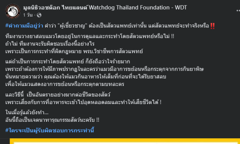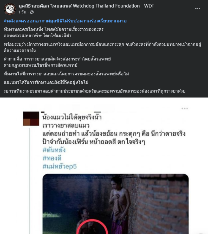 มูลนิธิวอชด็อกเตรียมแจ้งความกองละครแม่หยัว ชี้ประเด็นทารุณกรรมสัตว์ หลังพบแมวถูกวางยาสลบ