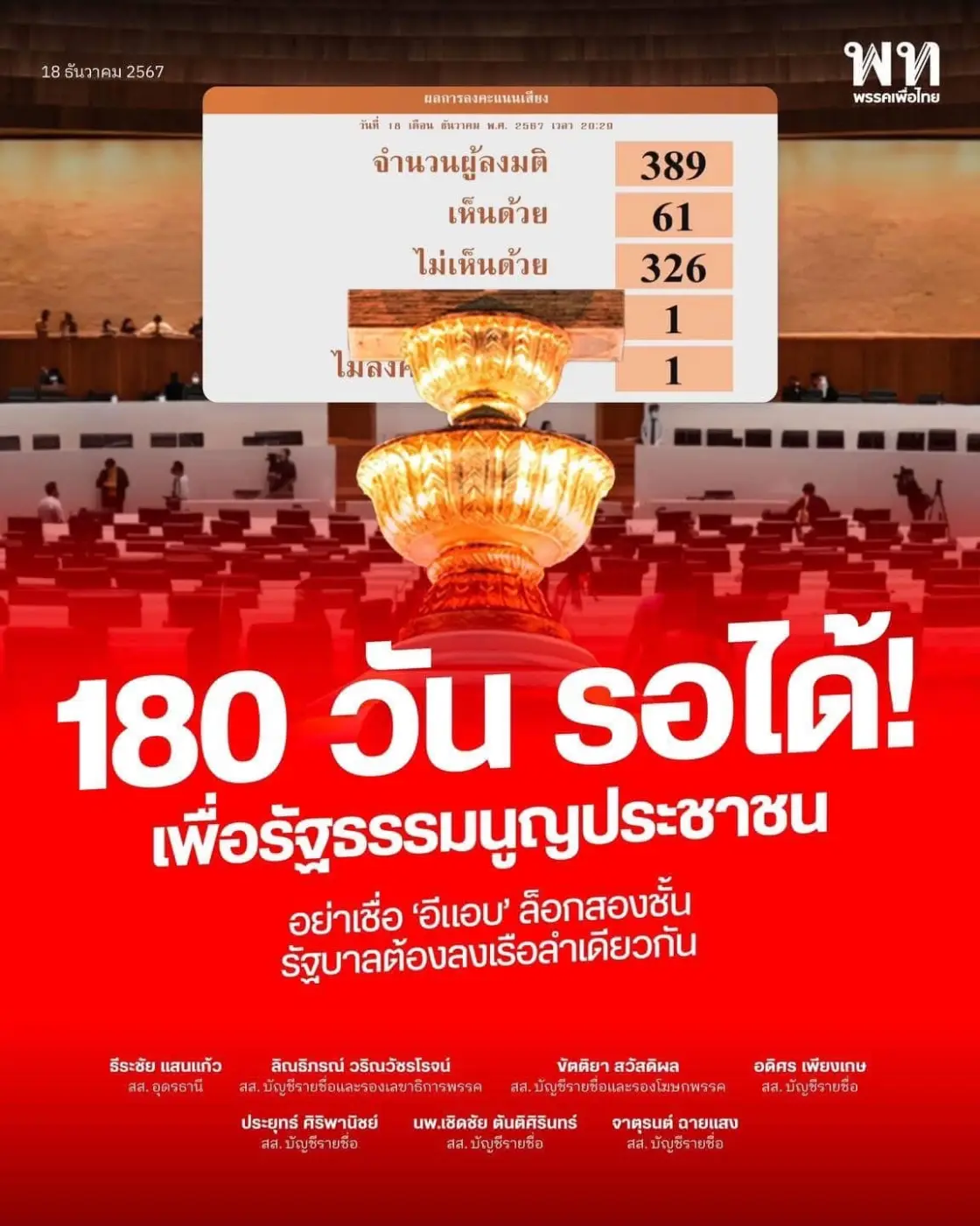 นายจาตุรนต์ ฉายแสง ส.ส.บัญชีรายชื่อ ย้ำว่าการรอ 180 วันเพื่อให้ได้กฎหมายประชามติที่ใช้เสียงข้างมากชั้นเดียวดีกว่าการยอมรับร่างที่ใช้เสียงสองชั้น เพราะจะเท่ากับเป็นการปิดประตูการแก้ไขรัฐธรรมนูญตลอดไป พร้อมเสนอให้ใช้เวลาระหว่างนี้ในการรณรงค์และหารือกับประชาชนเพื่อสร้างความเข้าใจและการสนับสนุน